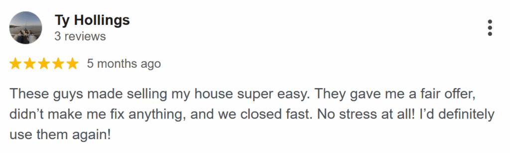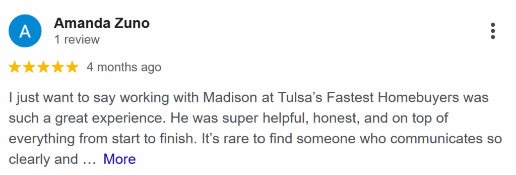 “I had a great experience selling my home to Tulsa’s Fastest Home Buyer. Their team was knowledgeable, friendly, and helped me get the best possible price for my home. Thank you for your excellent service!”