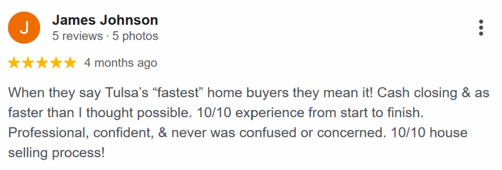 “If you’re looking to sell your home quickly, Tulsa’s Fastest Home Buyer is the way to go. Their team was professional, efficient, and always available to answer my questions. I highly recommend their services.”